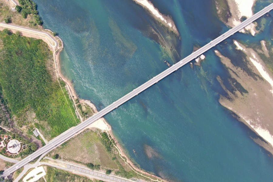 Foto aérea tirada em 26 de abril de 2022 mostra a reserva natural nacional da zona úmida do Rio Amarelo, no distrito de Mengjin, em Luoyang, Província de Henan, no centro da China. (Xinhua/Hao Yuan)