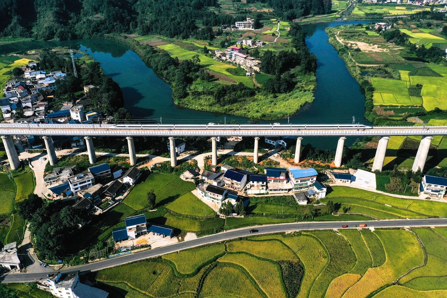 Trem-bala na ferrovia de alta velocidade Guiyang-Nanning na cidade de Duyun, Província de Guizhou, no sudoeste da China, em 31 de agosto de 2023. (Xinhua/Yang Wenbin)