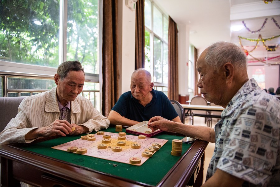 Residentes idosos jogam xadrez em um centro de bem-estar no distrito de Hanshou, cidade de Changde, Província de Hunan, centro da China, em 20 de junho de 2023. (Xinhua/Chen Sihan)