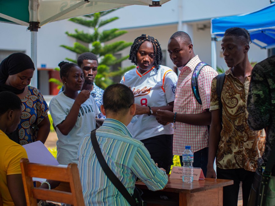 Candidatos a emprego conversam com recrutadores durante uma feira de empregos no Instituto Confúcio da Universidade de Lomé, em Lomé, Togo, em 24 de novembro de 2023. (Foto por Yawovi Kpowoenou/Xinhua)