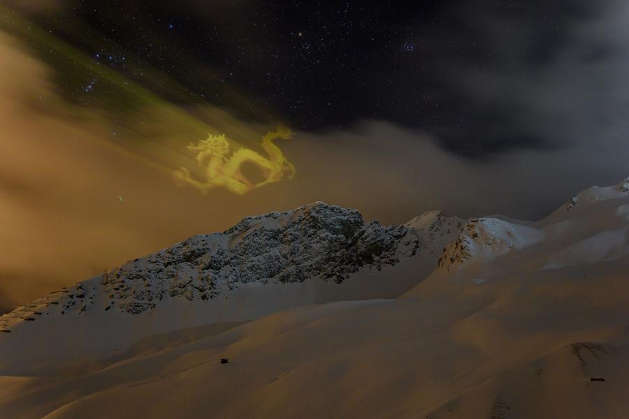 Foto tirada no dia 2 de fevereiro de 2024 mostra imagem de dragão projetado nas nuvens em Davos, na Suíça. Trabalho de projeção do artista de luz suíço, Gerry Hofstetter. (Foto por Mike Kessler/Xinhua)