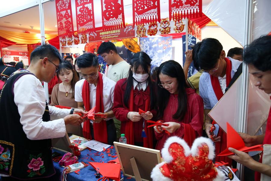 Visitantes aprendem a cortar papel durante abertura do evento de Feliz Ano Novo Chinês no Centro Cultural da China em Yangon, Mianmar, no dia 4 de fevereiro de 2024. (Foto por Myo Kyaw Soe/Xinhua)