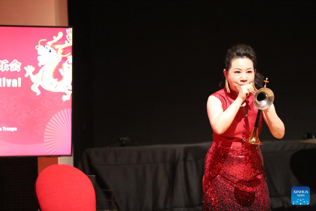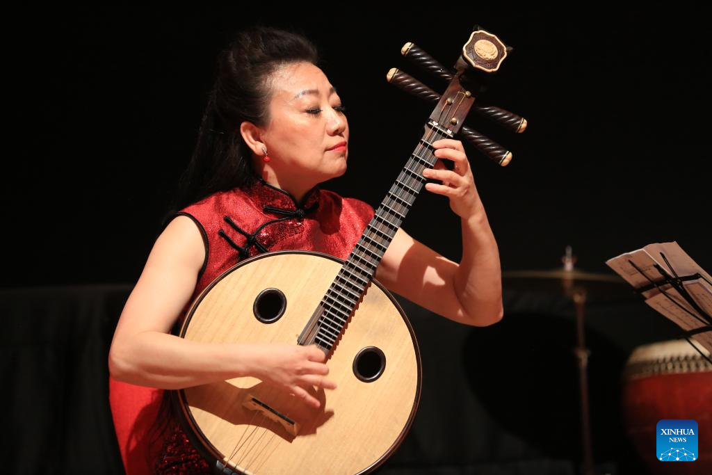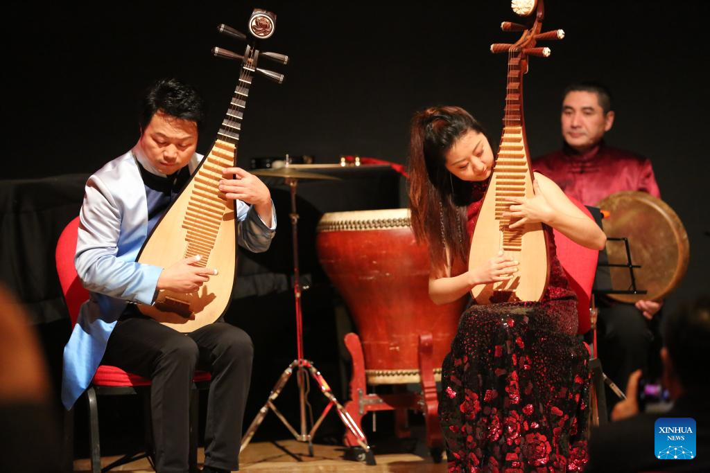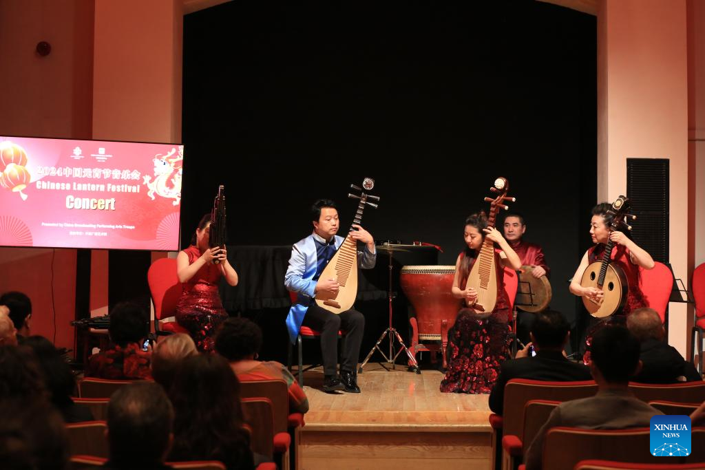 Artistas chineses se apresentam durante um concerto do Festival das Lanternas Chinesas em Valeta, Malta, em 21 de fevereiro de 2024. Um concerto para o Festival das Lanternas da China foi realizado no Centro Cultural da China em Malta na noite de quarta-feira, apresentando canções clássicas chinesas como "Dê-me uma rosa", "Paz Noturna" e "Luar sobre o Rio da Primavera". (Xinhua/Chen Wenxian)