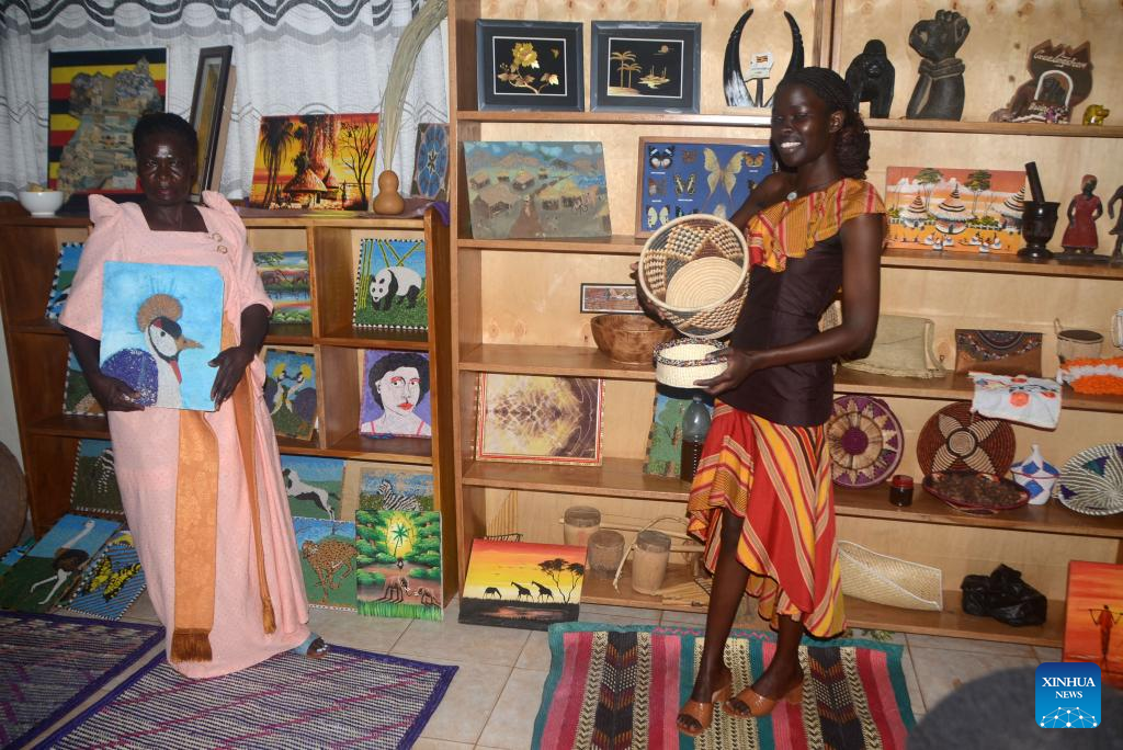 Expositores exibem seus produtos no recém-inaugurado Centro de Intercâmbio Cultural Luyanzi Uganda-China no Instituto de Tecnologia Luyanzi, Distrito de Wakiso, Uganda, em 8 de março de 2024. Um centro de intercâmbio cultural Uganda-China foi inaugurado na sexta-feira em uma escola profissionalizante no centro de Uganda, marcando o aprofundamento das relações culturais entre os dois países. (Foto por Nicholas Kajoba/Xinhua)