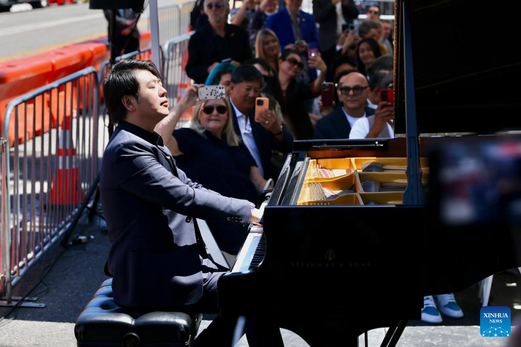 O pianista chinês Lang Lang se apresenta em sua cerimônia na Calçada da Fama de Hollywood em Los Angeles, Califórnia, Estados Unidos, em 10 de abril de 2024. O pianista chinês Lang Lang ganhou nesta quarta-feira uma estrela na Calçada da Fama de Hollywood em Los Angeles, na categoria de performance ao vivo. (Xinhua)