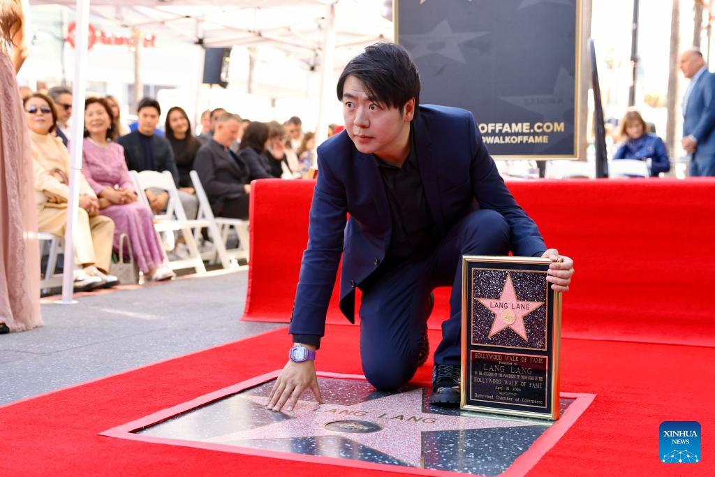 Los Angeles, 10 abr (Xinhua) -- O pianista chinês Lang Lang ganhou nesta quarta-feira uma estrela na Calçada da Fama de Hollywood em Los Angeles, na categoria de performance ao vivo.