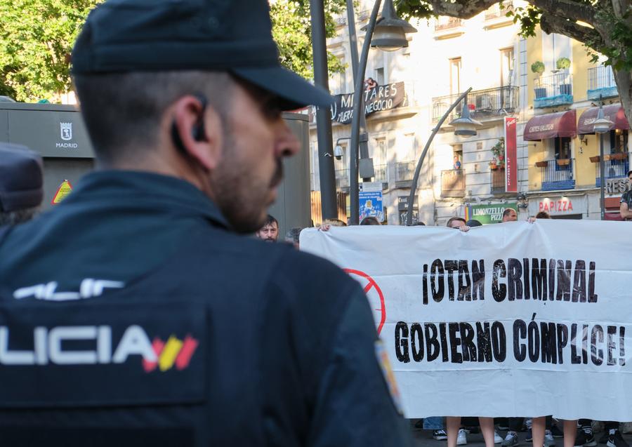 Polícia fica de guarda enquanto manifestantes protestam contra a cúpula da Organização do Tratado do Atlântico Norte (OTAN) na praça Tirso de Molina em Madri, Espanha, em 29 de junho de 2022. (Xinhua/Meng Dingbo)
