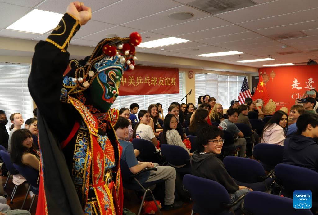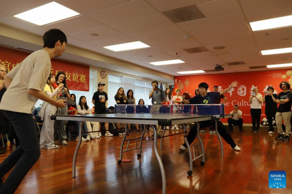 Foto tirada em 21 de maio de 2024 mostra uma partida de pingue-pongue durante uma aula de chinês realizada no Consulado Geral da China em Chicago, nos Estados Unidos. Cerca de 60 alunos do ensino médio do distrito das Escolas Públicas de Chicago (CPS, em inglês) tiveram uma experiência de imersão na cultura chinesa na terça-feira durante uma aula de chinês. (Foto por Wang Li/Xinhua)