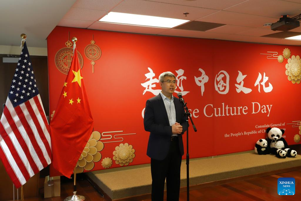 O cônsul geral da China em Chicago, Zhao Jian, discursa em uma aula de chinês realizada no Consulado Geral da China em Chicago, Estados Unidos, em 21 de maio de 2024. Cerca de 60 alunos do ensino médio do distrito das Escolas Públicas de Chicago (CPS, em inglês) tiveram uma experiência de imersão na cultura chinesa na terça-feira durante uma aula de chinês. (Foto por Wang Li/Xinhua)