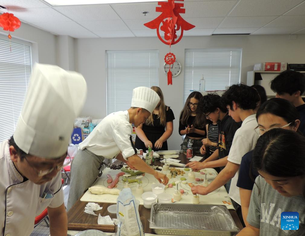 Estudantes fazem bolos durante uma aula de chinês realizada no Consulado Geral da China em Chicago, Estados Unidos, em 21 de maio de 2024. Cerca de 60 alunos do ensino médio do distrito das Escolas Públicas de Chicago (CPS, em inglês) tiveram uma experiência de imersão na cultura chinesa na terça-feira durante uma aula de chinês. (Foto por Wang Li/Xinhua)