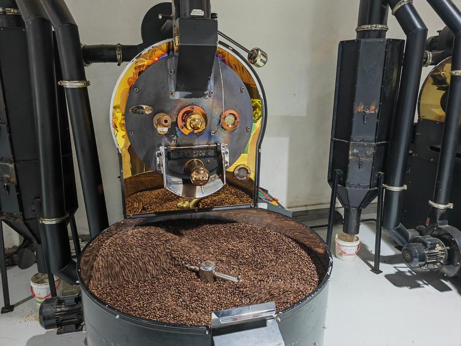 Foto tirada por celular mostra uma máquina torrando grãos de café em uma torrefação de café em Adis Abeba, capital da Etiópia, em 8 de junho de 2024. (Xinhua/Liu Fangqiang)