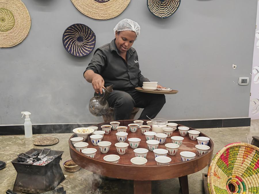 Foto tirada por celular mostra uma cerimônia tradicional de café em uma torrefação de café em Adis Abeba, capital da Etiópia, em 8 de junho de 2024. (Xinhua/Liu Fangqiang)