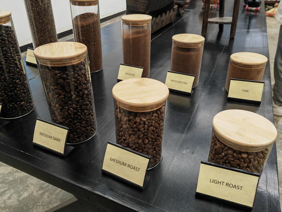 Foto tirada por celular mostra grãos de café de vários níveis de torrefação em uma torrefação de café em Adis Abeba, capital da Etiópia, em 8 de junho de 2024. (Xinhua/Liu Fangqiang)