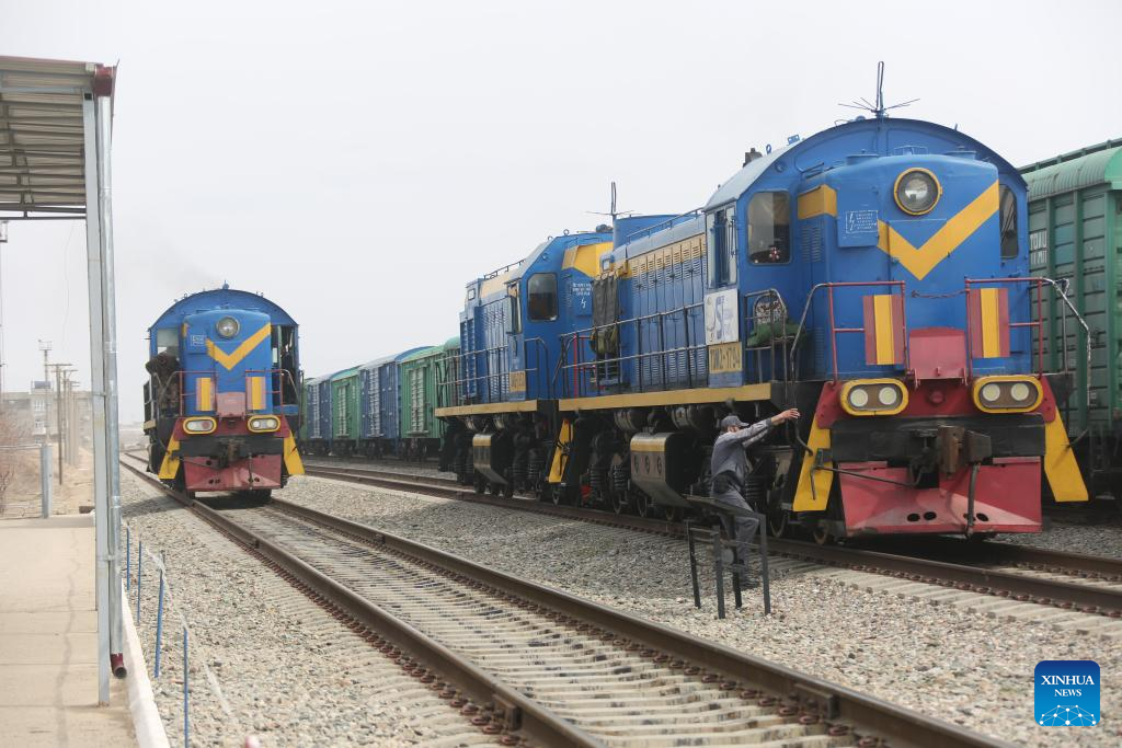 Foto tirada em 10 de março de 2024 mostra trens no porto terrestre de Hairatan, Província de Balkh, norte do Afeganistão. O barulho dos trens, a visão dos contêineres espalhados e as filas de caminhões aguardando mercadorias no porto terrestre de Hairatan, no norte do Afeganistão, apresentam um forte contraste com os desafios econômicos do país. Todos os dias, milhares de pessoas trabalham aqui para sustentar suas famílias. (Foto por Saifurahman Safi/Xinhua)