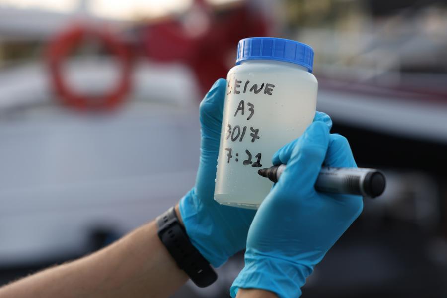 Engenheiro marca a amostra de água do teste de qualidade da água do Rio Sena ao lado da ponte Alexandre III, local do evento de triatlo, durante os Jogos Olímpicos de Paris 2024 em Paris, França, em 30 de julho de 2024. (Xinhua/Li Ming)