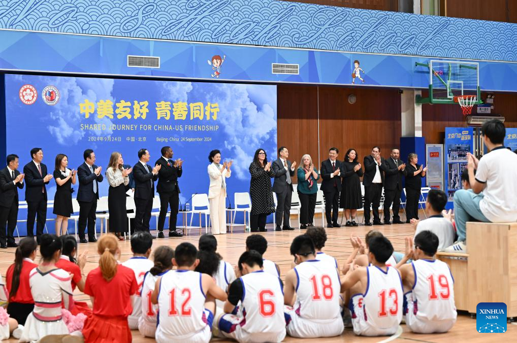 Beijing, 24 set (Xinhua) -- Peng Liyuan, esposa do presidente chinês Xi Jinping, participou de uma atividade de intercâmbio cultural e esportivo de jovens China-EUA na Escola Secundária Nº 8 de Beijing na tarde de terça-feira.