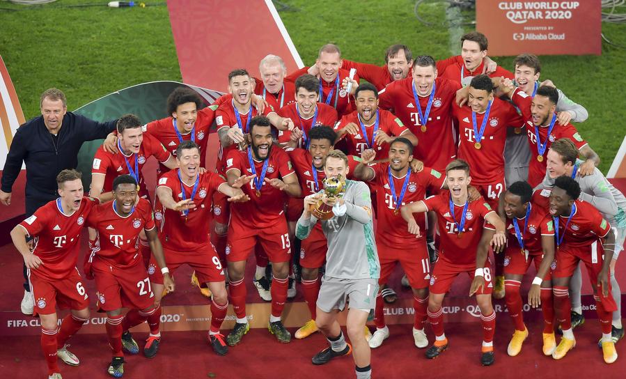 Goleiro do Bayern, Manuel Neuer, (frente) segura troféu enquanto jogadores do Bayern de Munique comemoram após vencer a final da Copa do Mundo de Clubes da FIFA contra o Tigres Uanl do México no Estádio Education City em Doha, Catar, no dia 11 de fevereiro de 2021. (Foto por Nikku/Xinhua)