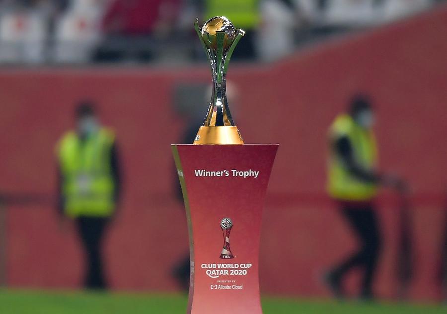 Foto tirada em 11 de fevereiro de 2021 mostra troféu do vencedor da Copa do Mundo de Clubes da FIFA antes da partida final contra o Tigres Uanl do México no Estádio Education City em Doha, Catar, no dia 11 de fevereiro de 2021. (Foto por Nikku/Xinhua)
