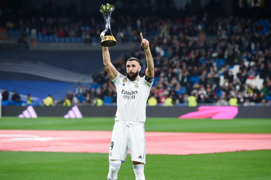Karim Benzema, do Real Madrid, mostra troféu da Copa do Mundo de Clubes da FIFA aos torcedores antes de partida de futebol da La Liga espanhola contra o Elche CF em Madri, Espanha, no dia 15 de fevereiro de 2023. (Foto por Gustavo Valiente/Xinhua)