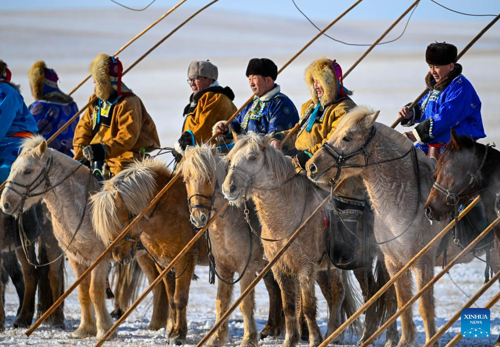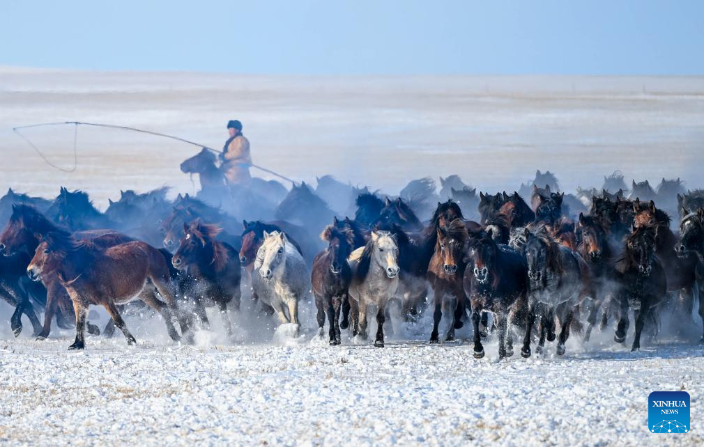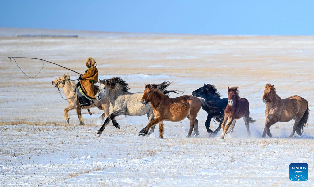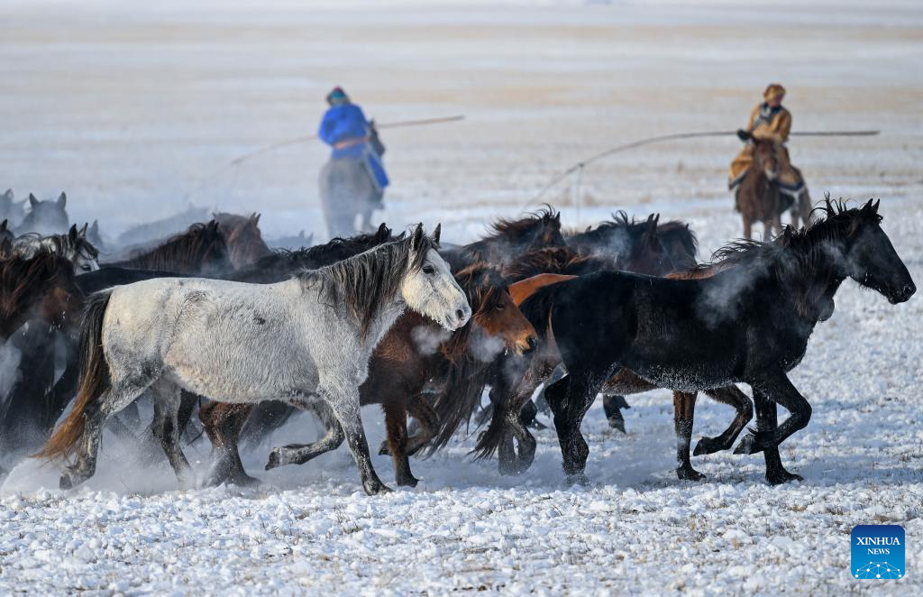 Pastores domam cavalos em pastagens cobertas de neve na Mongólia Interior, no norte da China-Xinhua