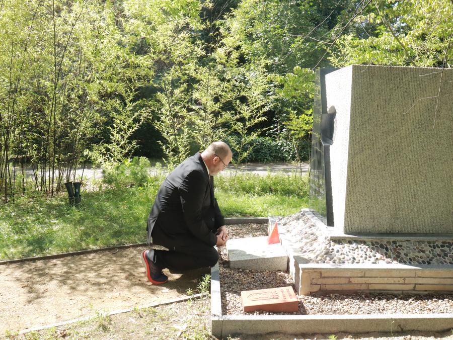 Christoph Reinhardt, bisneto de John Rabe, em luto no túmulo de John Rabe em Berlim, Alemanha, no dia 6 de julho de 2024. (Xinhua/Li Hanlin)