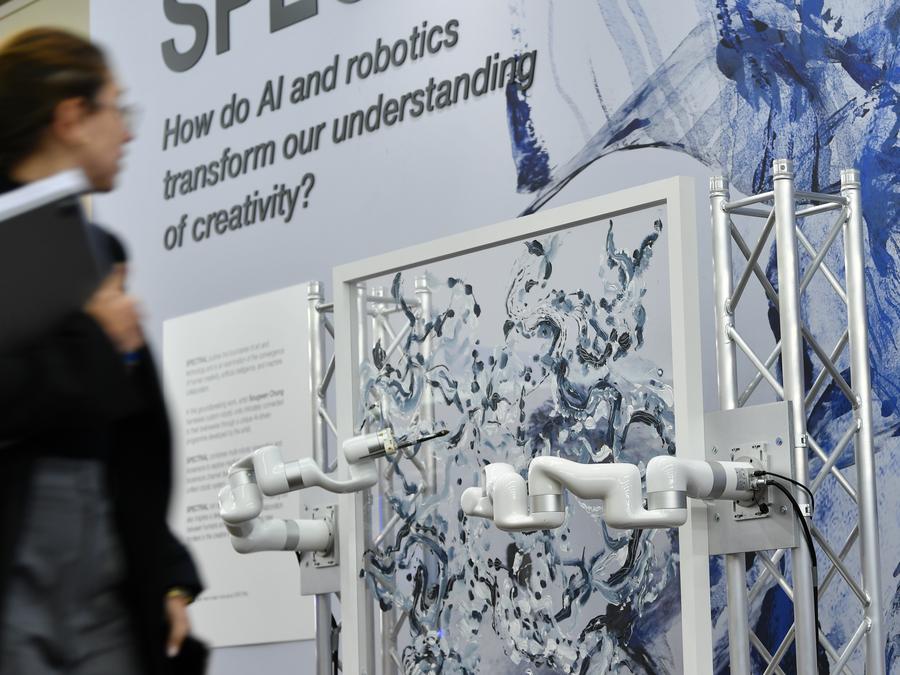 Mulher passa por braços robóticos fazendo pintura no Centro de Congressos para a Reunião Anual do Fórum Econômico Mundial (FEM) 2025 em Davos, Suíça, no dia 19 de janeiro de 2025. (Xinhua/Lian Yi)