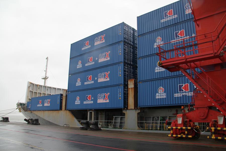 Foto tirada no dia 24 de janeiro de 2025 mostra navio de carga "KAWA Ningbo" do "Expresso China-Europa" em Wilhelmshaven, Alemanha. O primeiro navio porta-contêineres do "Expresso China-Europa", a rota direta mais rápida que conecta a Europa e a região do Delta do Rio Yangtze na China, chegou ao seu destino no Porto Jade Weser em Wilhelmshaven na sexta-feira. (Xinhua/Shan Weiyi)