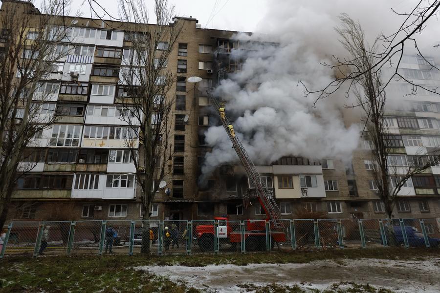 Edifício danificado atingido por bombardeio recente é retratado em Donetsk, no dia 19 de dezembro de 2023. (Foto por Victor/Xinhua)