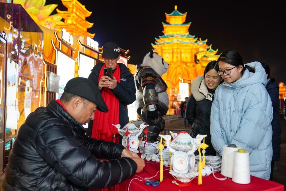 Turistas assistem ao artista Wan Songtao fazendo lanternas de porcelana para palácios no festival internacional de lanternas em Zigong, província de Sichuan, sudoeste da China, no dia 17 de janeiro de 2025. (Xinhua/Xu Bingjie)