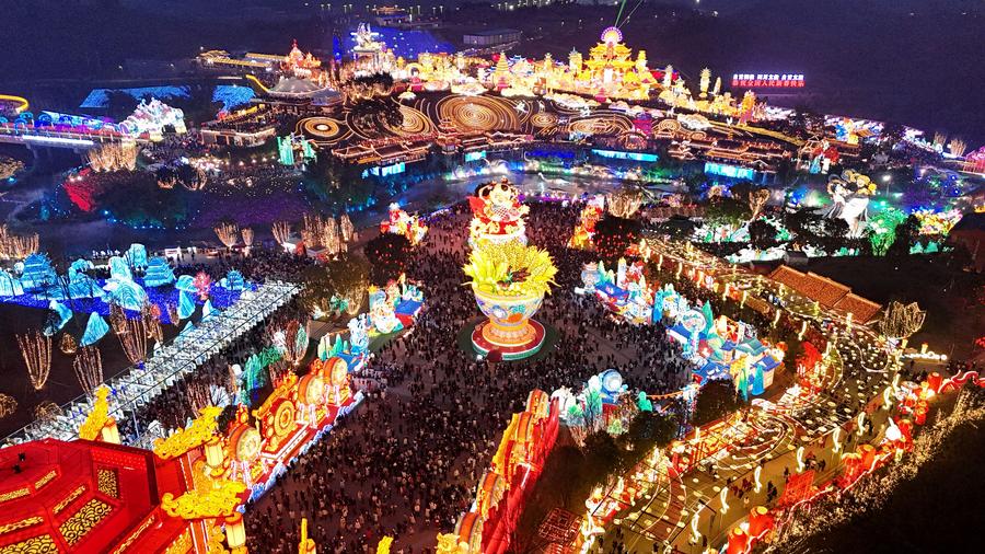 Foto aérea de drone tirada no dia 29 de janeiro de 2025 mostra turistas no festival internacional de lanternas em Zigong, província de Sichuan, sudoeste da China. (Xinhua)