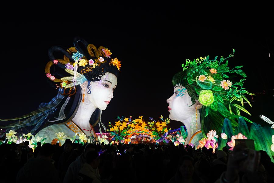 Chengdu, 14 fev (Xinhua) -- Cenas da lenda chinesa da Serpente Branca, um panda gigante de 8 metros de altura e dinossauros realistas, esses elementos ganham vida em um mundo de lanternas deslumbrante, lançando um brilho mágico sobre o céu noturno da cidade de Zigong, na província de Sichuan, sudoeste da China.