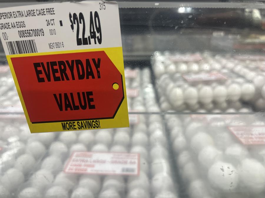 Foto tirada com smartphone no dia 7 de fevereiro de 2025 mostra preço de ovos em supermercado local em El Monte, Condado de Los Angeles, Califórnia, Estados Unidos. (Foto por Zeng Hui/Xinhua)