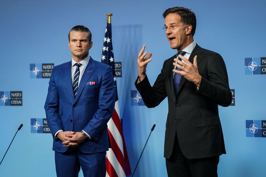 Secretário de Defesa dos EUA, Pete Hegseth (esquerda), e secretário-geral da OTAN, Mark Rutte, participam de coletiva de imprensa em Bruxelas, Bélgica, no dia 13 de fevereiro de 2025. (Xinhua/Peng Ziyang)