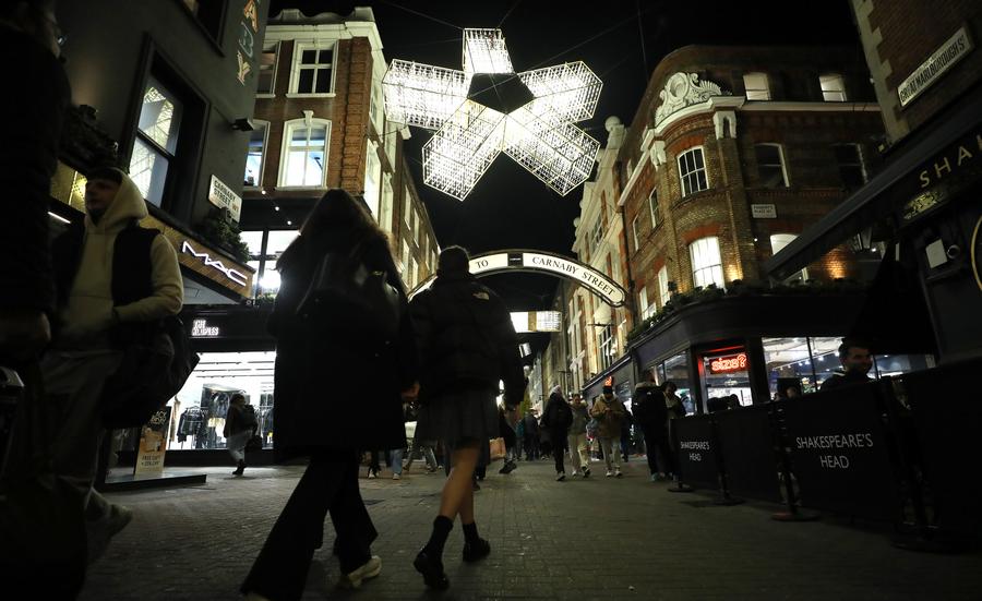 Pessoas caminham na Carnaby Street decorada com luzes no centro de Londres, Reino Unido, em 27 de novembro de 2024. (Xinhua/Li Ying)
