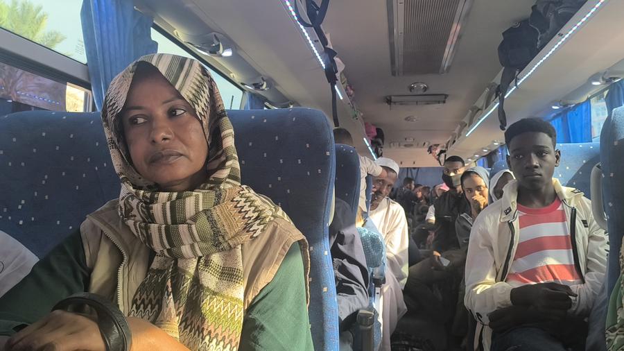 Foto tirada com celular em Port Sudan mostra grupo de pessoas deslocadas em ônibus antes de voltar a Wad Madani, capital do estado de Gezira, centro do Sudão, como parte de um programa governamental para retorno voluntário, no dia 10 de fevereiro de 2025. (Foto por Urqia Elzaki/Xinhua)