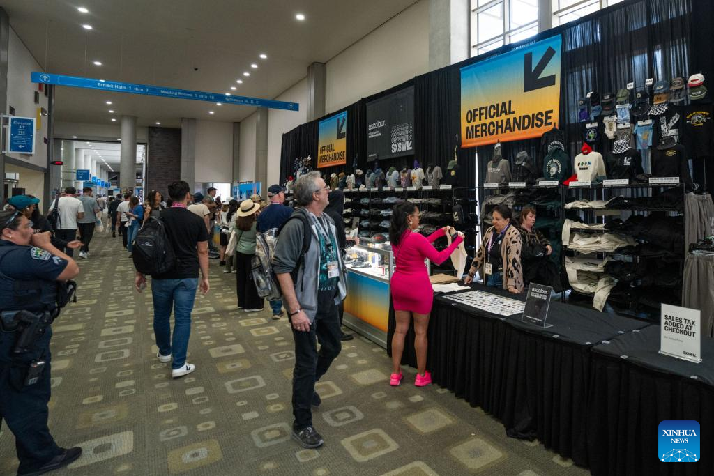 Pessoas compram produtos oficiais no festival South by Southwest (SXSW) 2025 em Austin, Texas, Estados Unidos, no dia 7 de março de 2025. A convergência anual de tecnologia, cinema e música começou na sexta-feira, transformando a capital do estado em um centro de vitrines de inovação, painéis de tecnologia e networking intercultural, juntamente com uma programação de música ao vivo, comédia e exibições de filmes. (Foto por Christopher Davila/Xinhua)