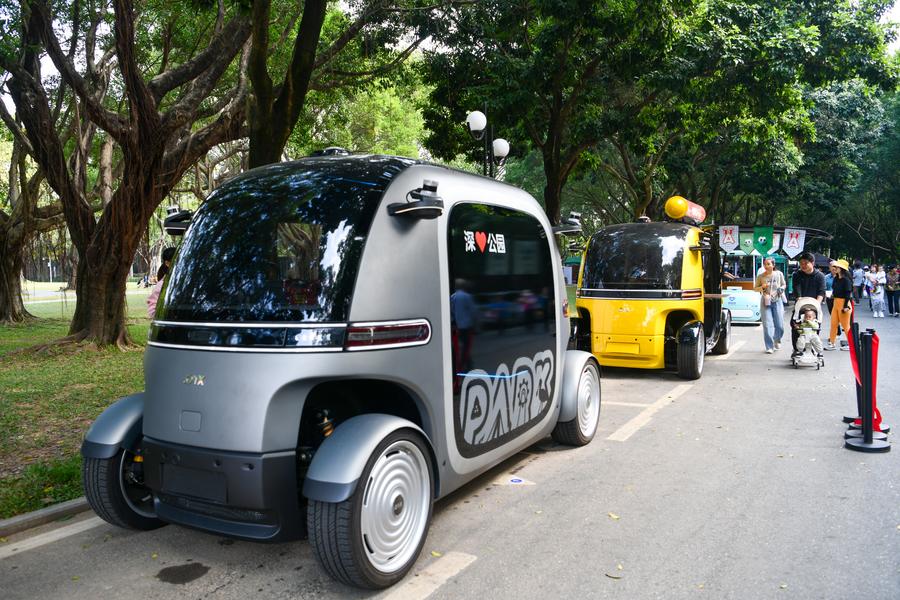 Foto tirada no dia 11 de novembro de 2024 mostra veículos inteligentes não tripulados no Parque Lianhuashan em Shenzhen, província de Guangdong, sul da China. (Xinhua/Liang Xu)