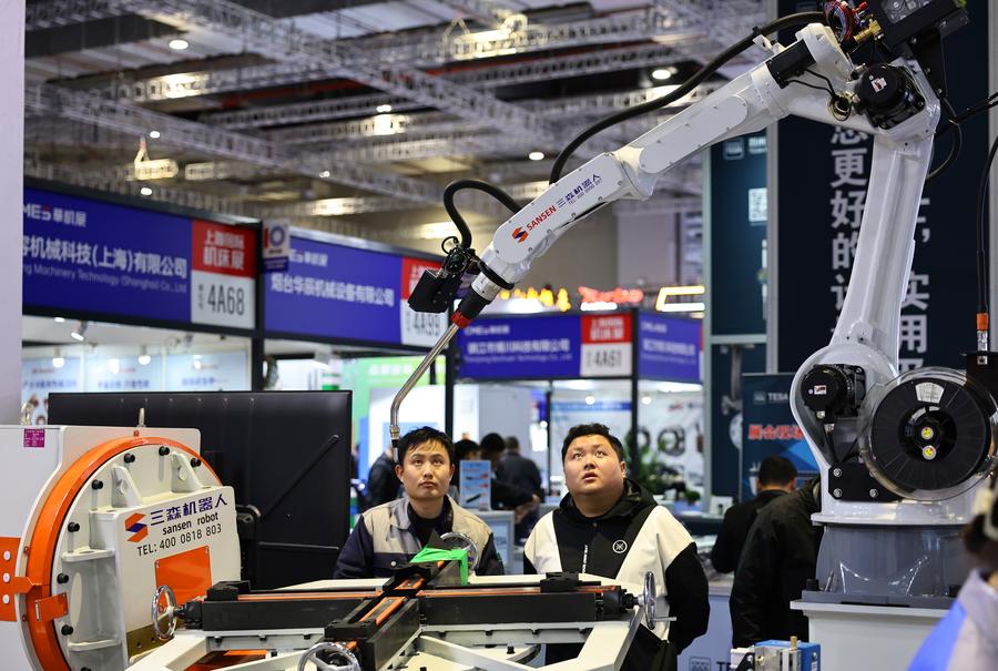 Visitantes observam demonstração de robô na Exposição Internacional de Máquinas e Ferramentas de Shanghai, leste da China, no dia 3 de março de 2025. (Xinhua/Fang Zhe)