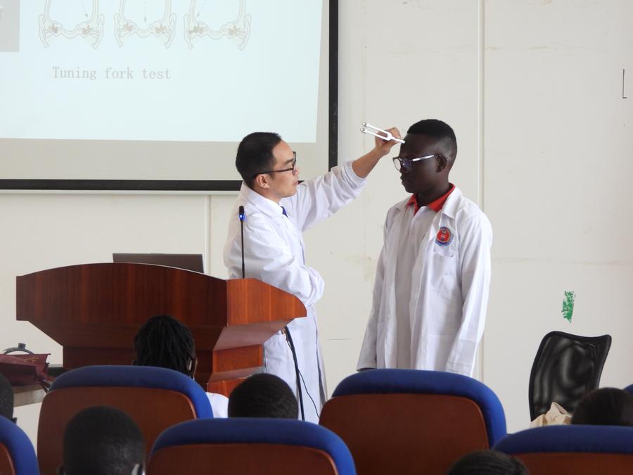 Um médico chinês demonstra como realizar um teste Rinne no Hospital Universitário de Juba, em Juba, capital do Sudão do Sul, em 20 de março de 2025. (Foto por Denis Elamu/Xinhua)