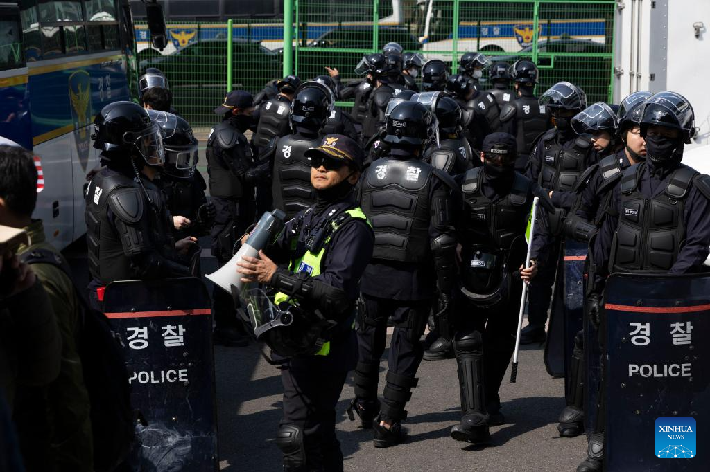 Polícia monta guarda perto da residência presidencial em Seul, Coreia do Sul, no dia 4 de abril de 2025. O presidente da Coreia do Sul, Yoon Suk-yeol, foi deposto do cargo na sexta-feira enquanto o tribunal constitucional mantinha uma moção do parlamento para impeachment de Yoon por sua curta imposição da lei marcial em dezembro passado. Moon Hyung-bae, chefe interino do tribunal, leu a decisão sobre o impeachment de Yoon, que foi transmitida ao vivo para todo o país, dizendo que a decisão dos oito juízes foi unânime. (Foto por Jun Hyosang/Xinhua)