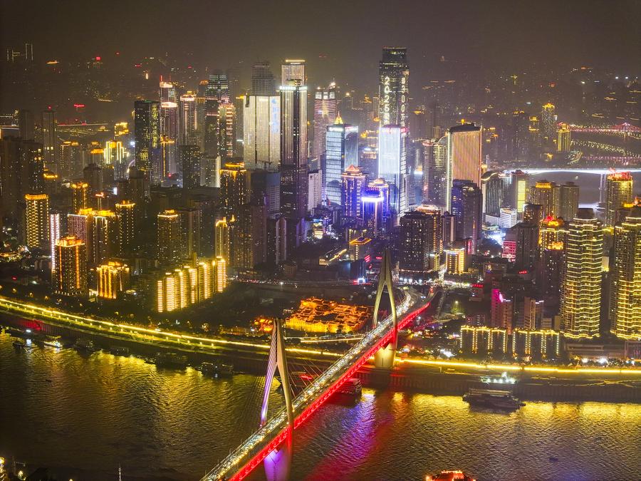 Foto aérea de drone mostra centro de Chongqing à noite, sudoeste da China, no dia 28 de fevereiro de 2025. (Xinhua/Wang Quanchao)