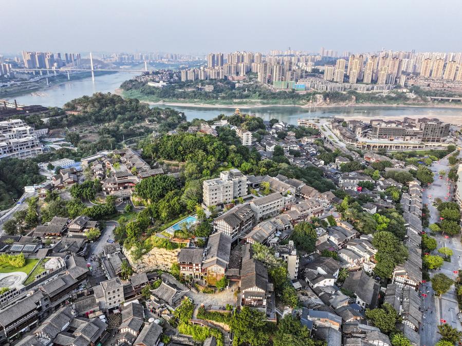 Foto aérea tirada por drone em 9 de outubro de 2024 mostra uma vista da vila antiga de Ciqikou, no Município de Chongqing, sudoeste da China. (Xinhua/Wang Quanchao)