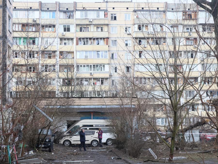 Foto tirada no dia 21 de março de 2024 mostra prédio atingido por ataque com mísseis em Kiev, Ucrânia. (Foto por Roman Petushkov/Xinhua)