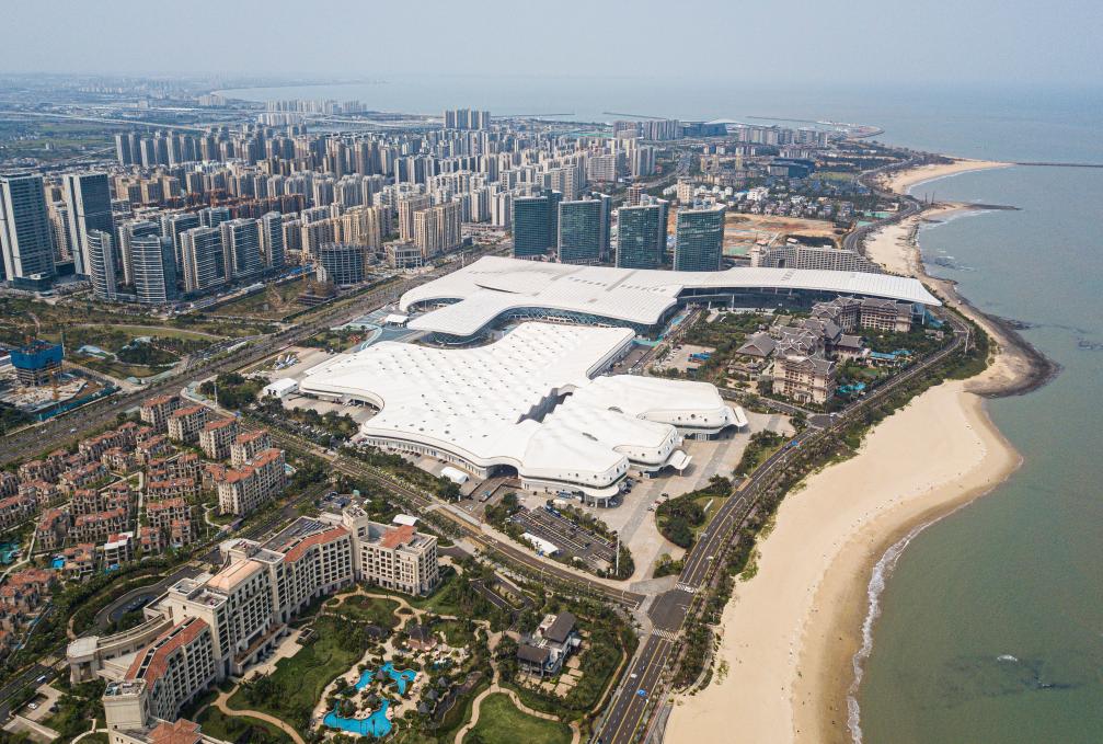Foto aérea tirada em 4 de abril de 2025 mostra uma vista externa do Centro Internacional de Convenções e Exposições de Hainan, o principal local da 5ª Exposição Internacional de Produtos de Consumo da China, em Haikou, Província de Hainan, no sul da China. (Xinhua/Pu Xiaoxu)