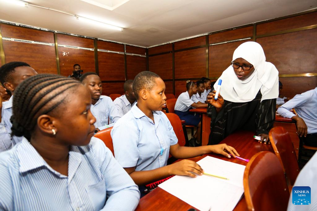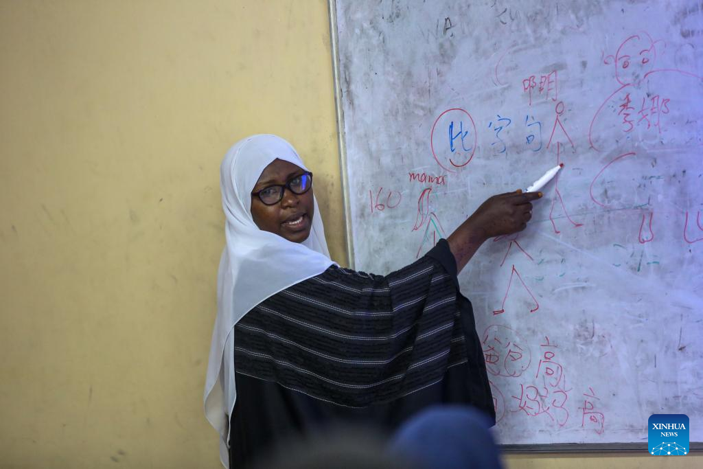 Asha Fum Khamis, professora de língua chinesa designada pelo Instituto Confúcio, ensina língua chinesa na Escola Nacional de Turismo em Dar es Salã, Tanzânia, no dia 8 de abril de 2025. Com o crescente fluxo de turistas chineses, a escola pública de turismo da Tanzânia lançou cursos de chinês em colaboração com o Instituto Confúcio da Universidade de Dar es Salã para formar profissionais no setor. Dos 531 estudantes matriculados, 215 escolheram estudar chinês. (Xinhua/Emmanuel Herman)