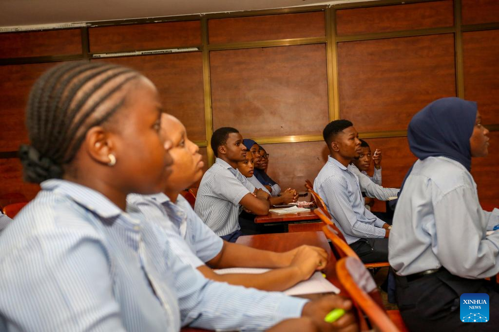 Estudantes tanzanianos em aula de chinês na Escola Nacional de Turismo em Dar es Salã, Tanzânia, no dia 8 de abril de 2025. Com o crescente fluxo de turistas chineses, a escola pública de turismo da Tanzânia lançou cursos de chinês em colaboração com o Instituto Confúcio da Universidade de Dar es Salã para formar profissionais no setor. Dos 531 estudantes matriculados, 215 escolheram estudar chinês. (Xinhua/Emmanuel Herman)