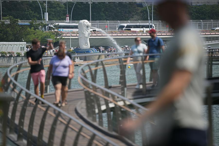 Turistas visitam Parque Merlion na Marina Bay de Cingapura no dia 13 de agosto de 2024. (Foto por Then Chih Wey/Xinhua)