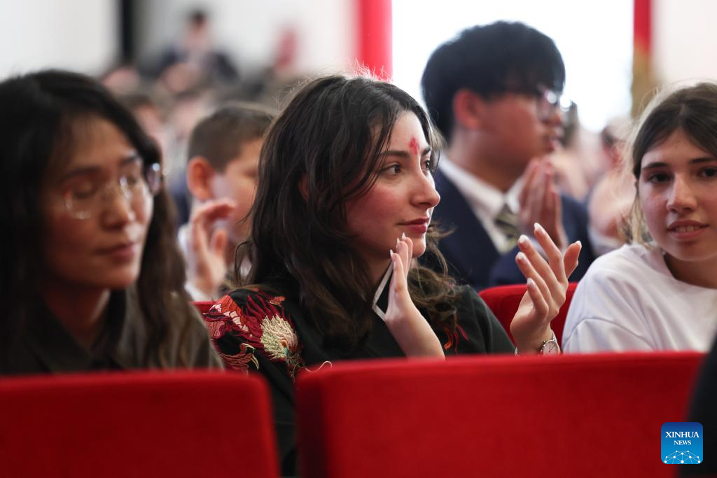 Estudantes participam de evento cultural chinês chamado "Celebrando a Primavera" em Roma, Itália, no dia 8 de abril de 2025. Dezenas de estudantes italianos em um internato em Roma demonstraram sua paixão pela língua e cultura chinesas por meio de várias apresentações na terça-feira. (Xinhua/Li Jing)
