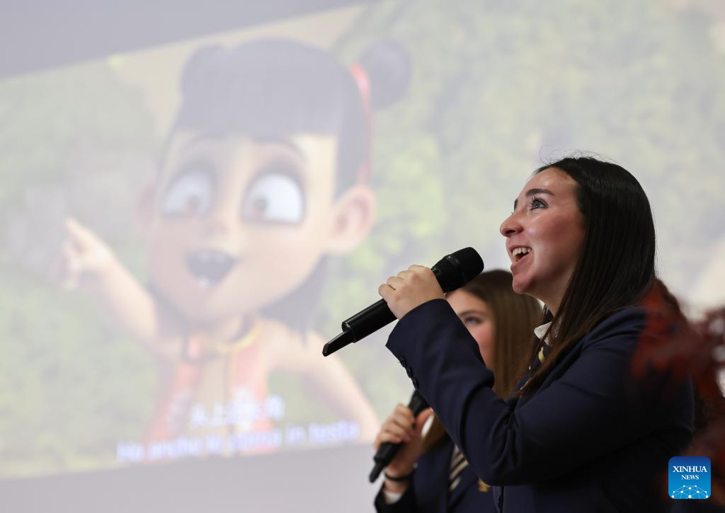 Estudantes dublam filme de animação chinês Ne Zha em evento cultural chinês chamado "Celebrando a Primavera" em Roma, Itália, no dia 8 de abril de 2025. Dezenas de estudantes italianos em um internato em Roma demonstraram sua paixão pela língua e cultura chinesas por meio de várias apresentações na terça-feira. (Xinhua/Li Jing)