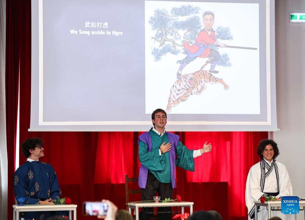 Roma, 8 abr (Xinhua) -- Danças com o tema da Fênix, recitações de clássicos chineses antigos e dublagens da animação chinesa Ne Zha. Na terça-feira, dezenas de estudantes italianos em um internato em Roma demonstraram sua paixão pela língua e cultura chinesas por meio de várias apresentações.